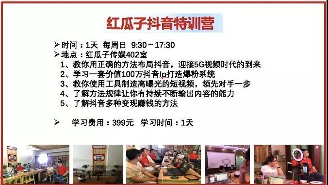 5G时代来临,信息以短视频形式来传播,抖音是全球短视频流量最大的平台,沃尔玛一条抖音增加2000万收入,一条抖音为华为手机单店增加650万收入,怎样用好抖音,对我们个人和公司都非常重要,红瓜子抖音研究院每天都有组织《抖音剧场》节目和每周日都举行《抖音特训营》培训,欢迎大家积极参加